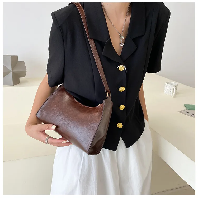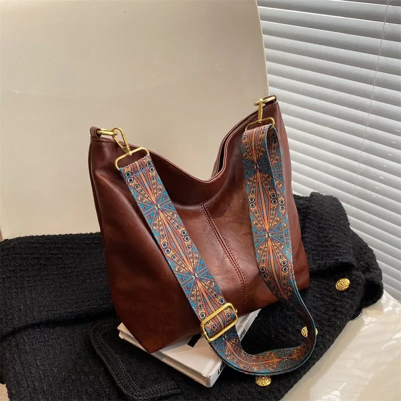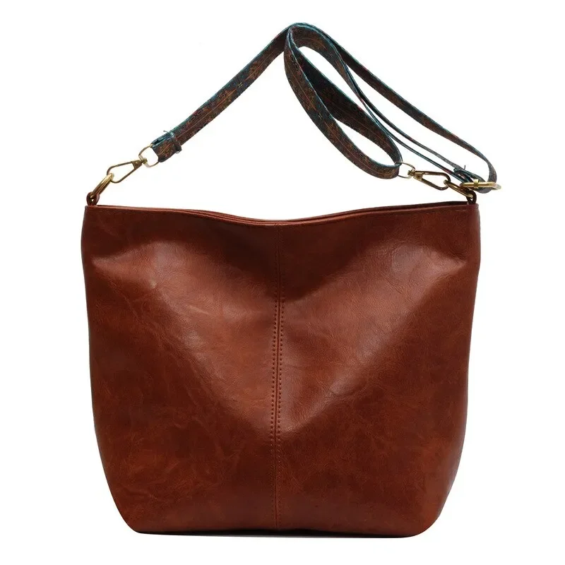 Vintage solid color PU leather women Fashion shoulder sling bag simple wide strap bucket crossbody bag